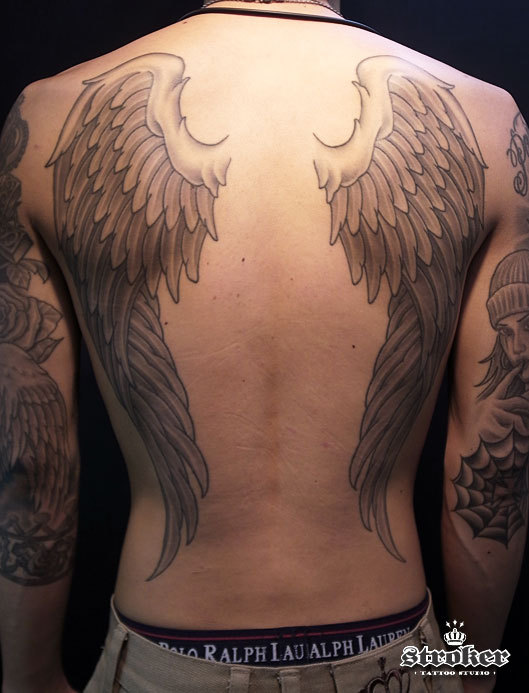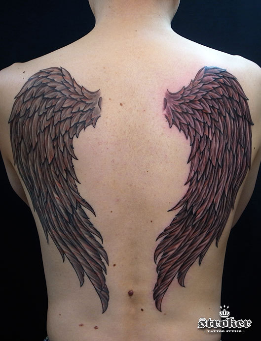 今日は背中に彫られた翼タトゥーを