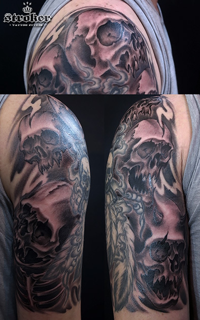 ヒジには、以前彫らせていただいたクモの巣があり、