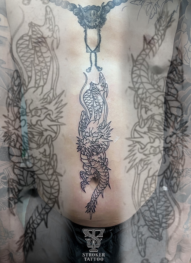 お腹の真ん中に龍を彫らせていただきました。