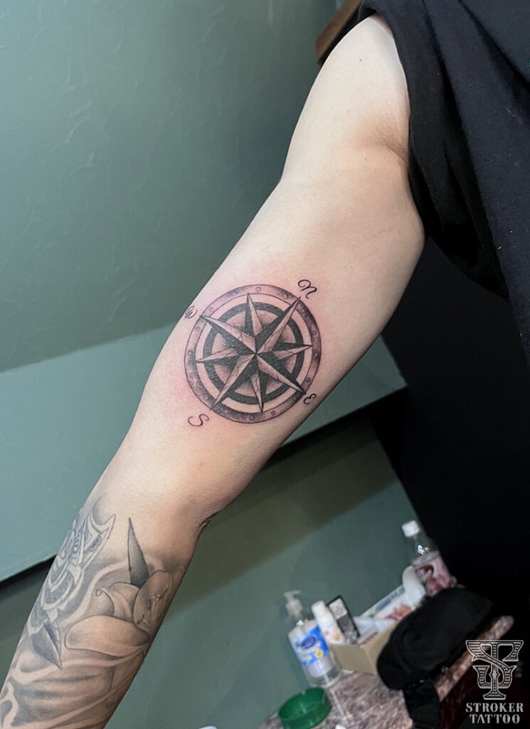 二の腕の内側にコースターくらいのサイズのコンパス。