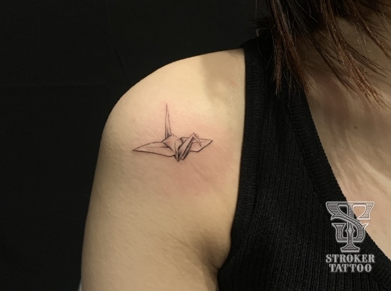 肩に折り鶴。