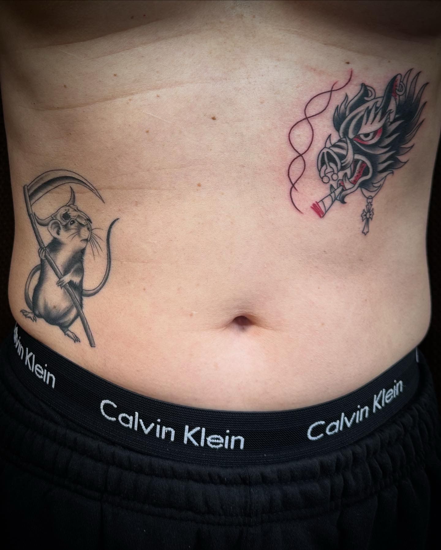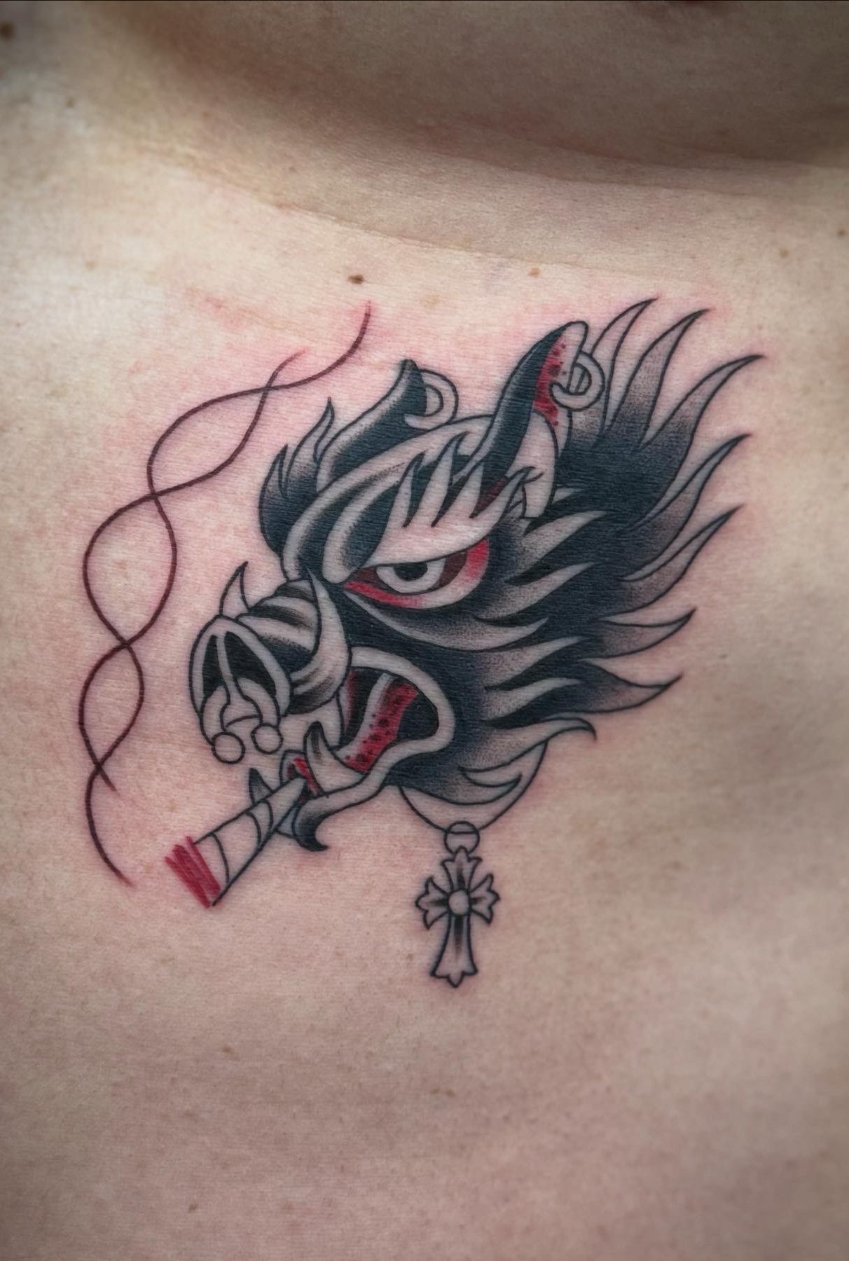 イノシシ Posted on 2025年4月5日 in Tattoo作品【カラー】 こんばんは。 エリカです。 今日はカスタムさんの息子さんの生まれ年の干支、イノシシです。 ピアス、巻きタバコ、イアフォン、ネックレスなどはカスタムさんのこだわりです。 色は黒と赤の2色使いました。 ヨーロッパでは、イノシシのタトゥーは、強さ、勇気、凶暴さ、おもてなし、または知恵を象徴するとも言われてます。 . 関連記事はこちら No related posts.