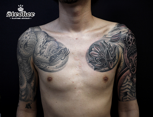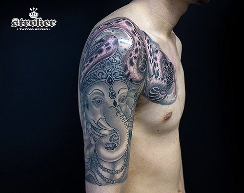 以前、右腕のガネーシャと蛇を彫らせていただき、
