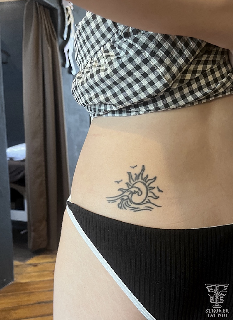 波、太陽、カモメのラインワークタトゥー。