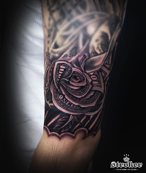 手首の袖から繋がるイメージで、$のお札でできた薔薇を描いてゆきました。