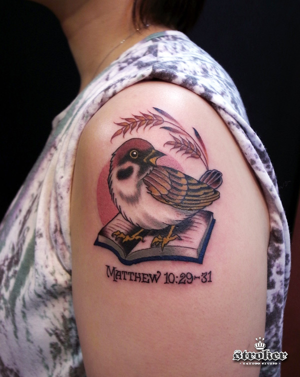 スズメと麦と本。。。聖書の一節だそうです。