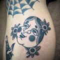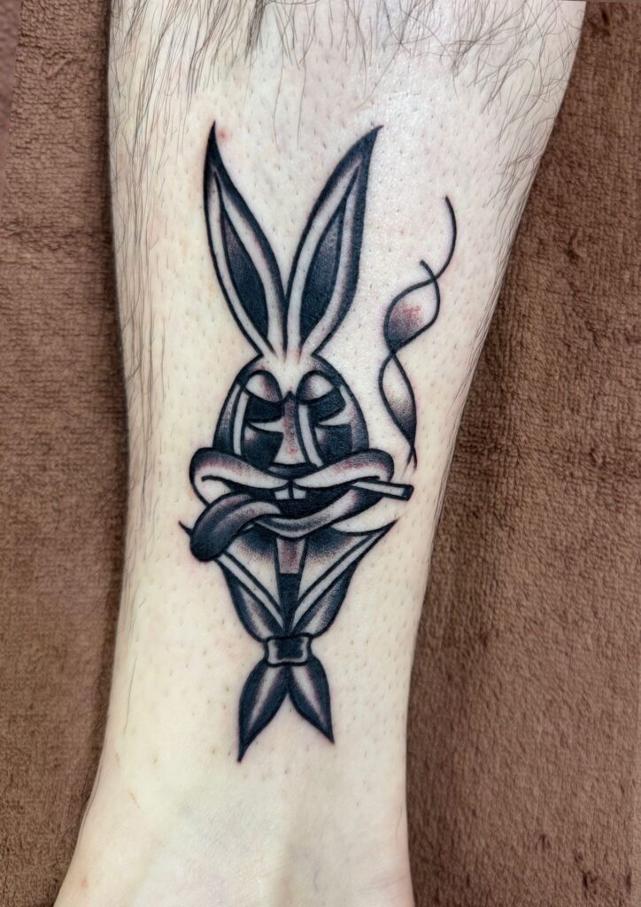 スモーカーラビット Posted on 2025年11月15日 in Tattoo作品【ブラックワーク】 こんばんは。 エリカです。 今日はアメトラのうさぎです。 タバコを吸いながら文句を言ってるような顔にしました。 40年代の漫画のようなテイストで描いてみました。 セーラ服はカスタムさんのこだわりの一つです。 ボカシは優しいぼかしより針のドットが残るように入れて、濃いめと薄めのぼかしに分けました。 . . . 関連記事はこちら おかめさんと笠おばけ タトゥーフラッシュ!