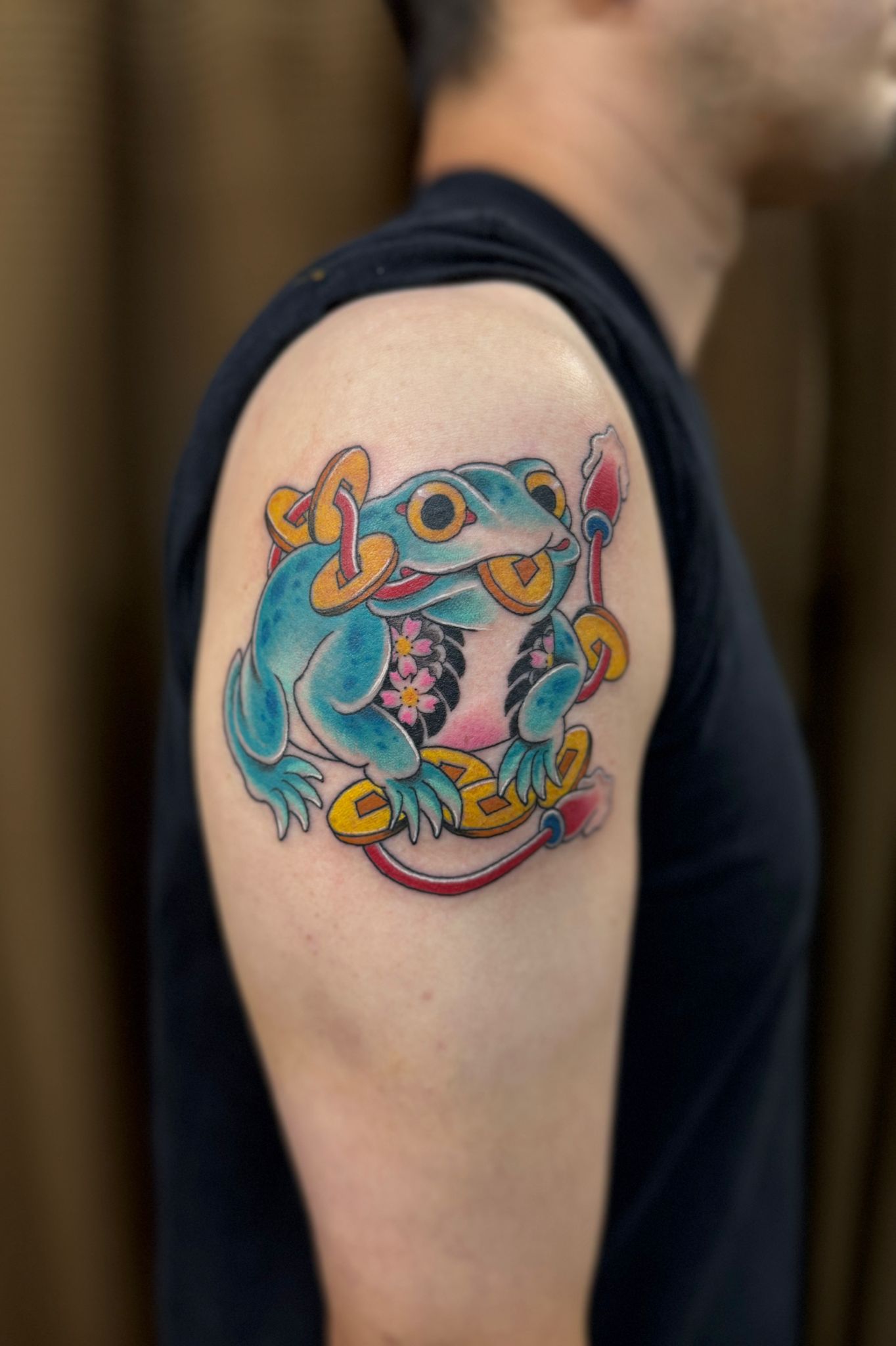 ゼニガエル Posted on 2025年8月9日 in Tattoo作品【カラー】 こんばんは。 エリカです。 今日のカスタムさんは遠くからお越しいただいて打ち合わせ無しで当日デザインの確認していただきました。 メールのやり取りがとてもスムーズで分かりやすかったため、デザインもお客様の好みに準備することができました。 顔はいかついてるより、可愛いようにしました。 カラーも明るく、ちょっと派手な感じに仕上がりました。. . . 関連記事はこちら No related posts.