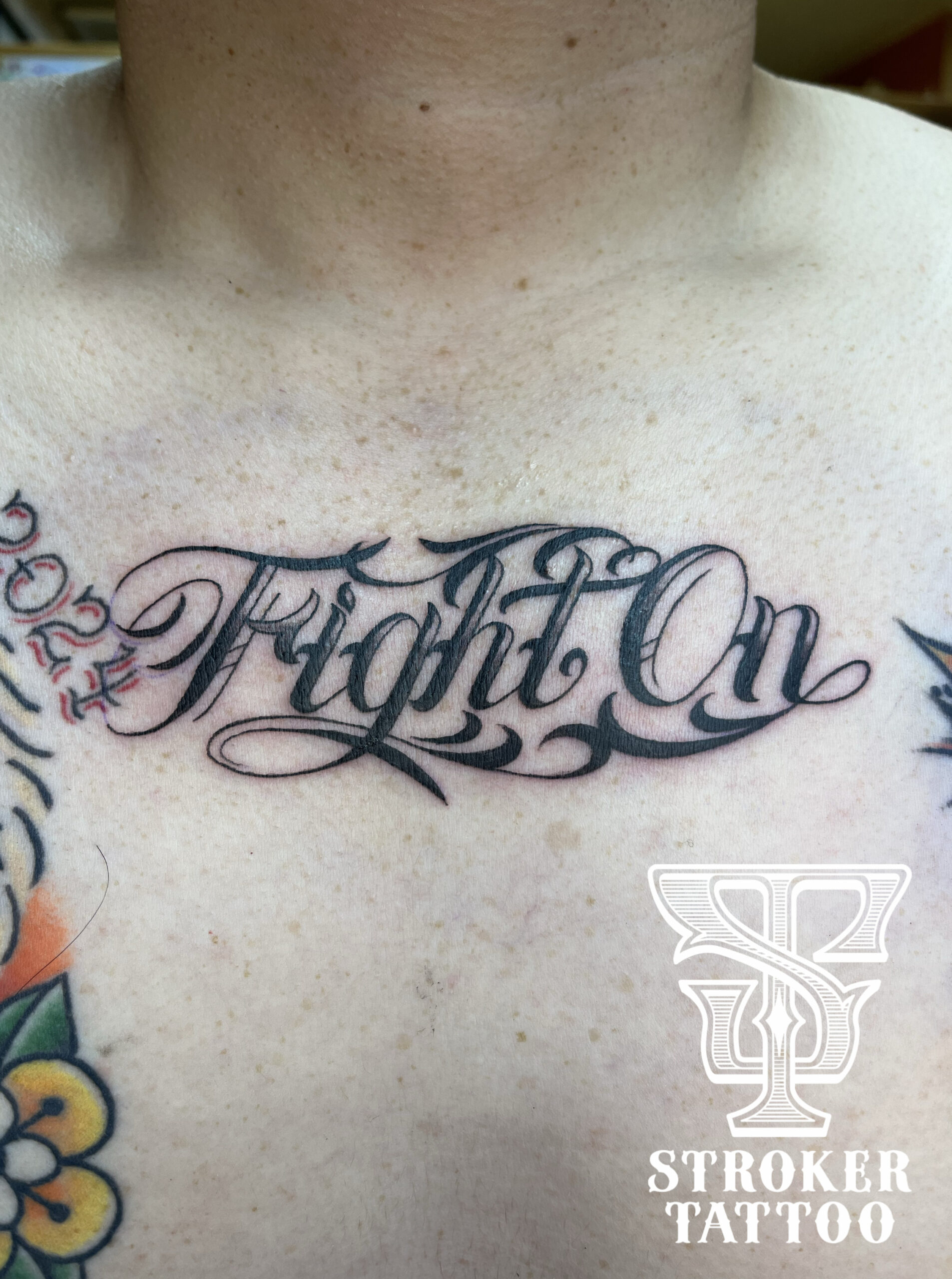 最後は胸の中心にスマホ程のサイズでお入れしたスクリプトタトゥーになります。