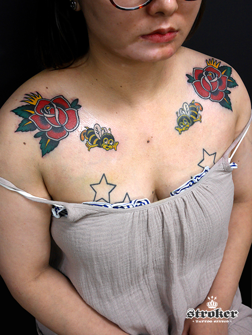 両肩のバラと画面左のハチは今回自分が彫らせていただいたものです^^
