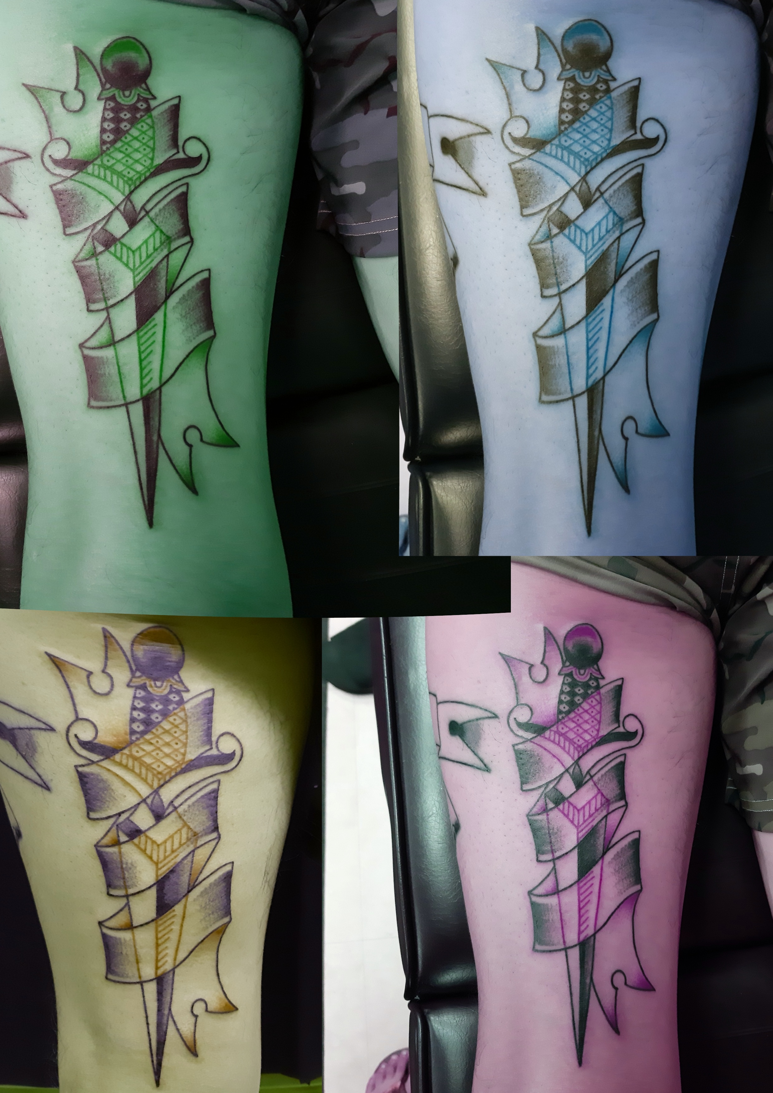 ナイフタトゥー Posted on 2020年7月26日 in Tattoo作品【カラー】 こんばんは! エリカです。 今日は赤と黒のナイフタトゥーです。 太ももの裏側に、トラディショナルのデザインです。 . . . リボンには文字がなくても良い感じだと思います。 赤色のところを外の色でもカッコいいかな? 青、オレンジ、緑色なども悪くないですね。 外の色で見るために、iPadを弄ってみました。 関連記事はこちら No related posts.