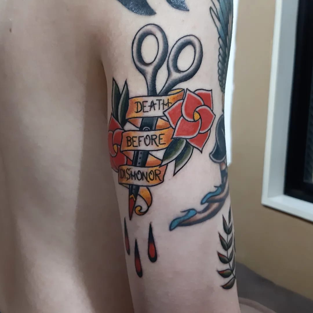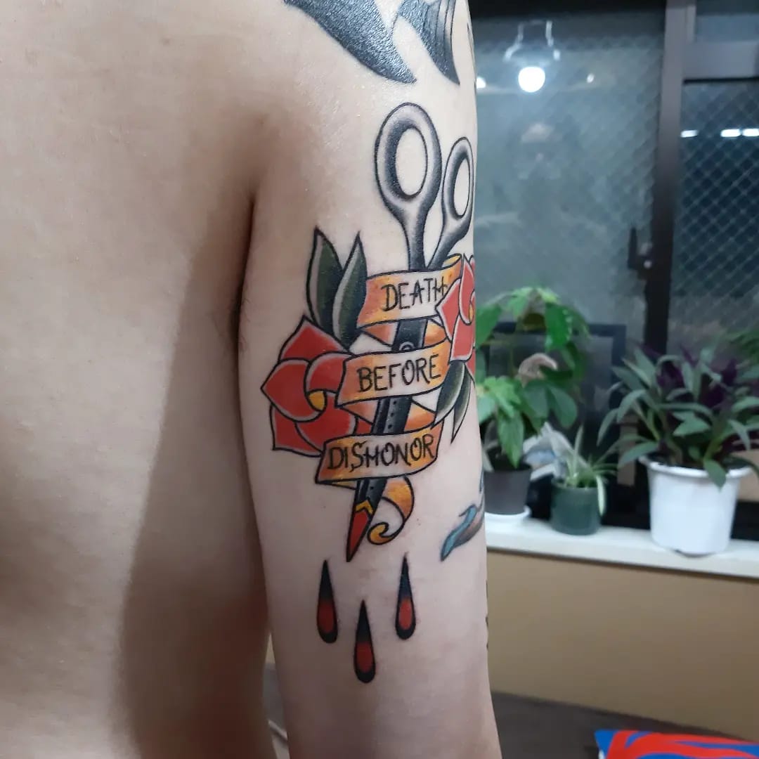 ハサミとシェイクハンド Posted on 2022年10月29日 in Tattoo作品【カラー】 こんばんは。 エリカです。 急に冬が来たような感じで、とても寒くなりましたね。 富士山も白くなりました。 *10月25日朝8時の写真です* 今日のタトゥーはオールドスクールのデザインです。 ハサミ、バラとレタリング 良くあるダガーのデザインをハサミに変えました。 シェイクハンド 小さめのサイズでしたのでシンプルではっきり見えるように色も少なめにしました。 🌿🤝🌿 🌹✂️🌹 関連記事はこちら No related posts.
