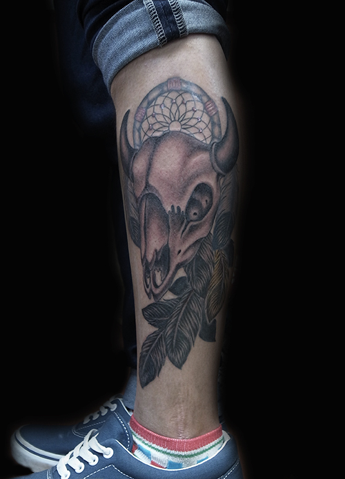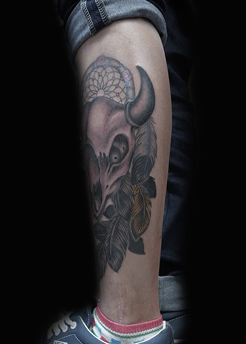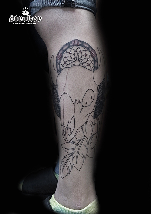 お客さんのご希望で羽がスネの方にかかる様な構図で、