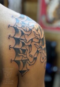 肩がまるッと埋まるなかなか大きなサイズで、次回カラーが入って完成予定です。