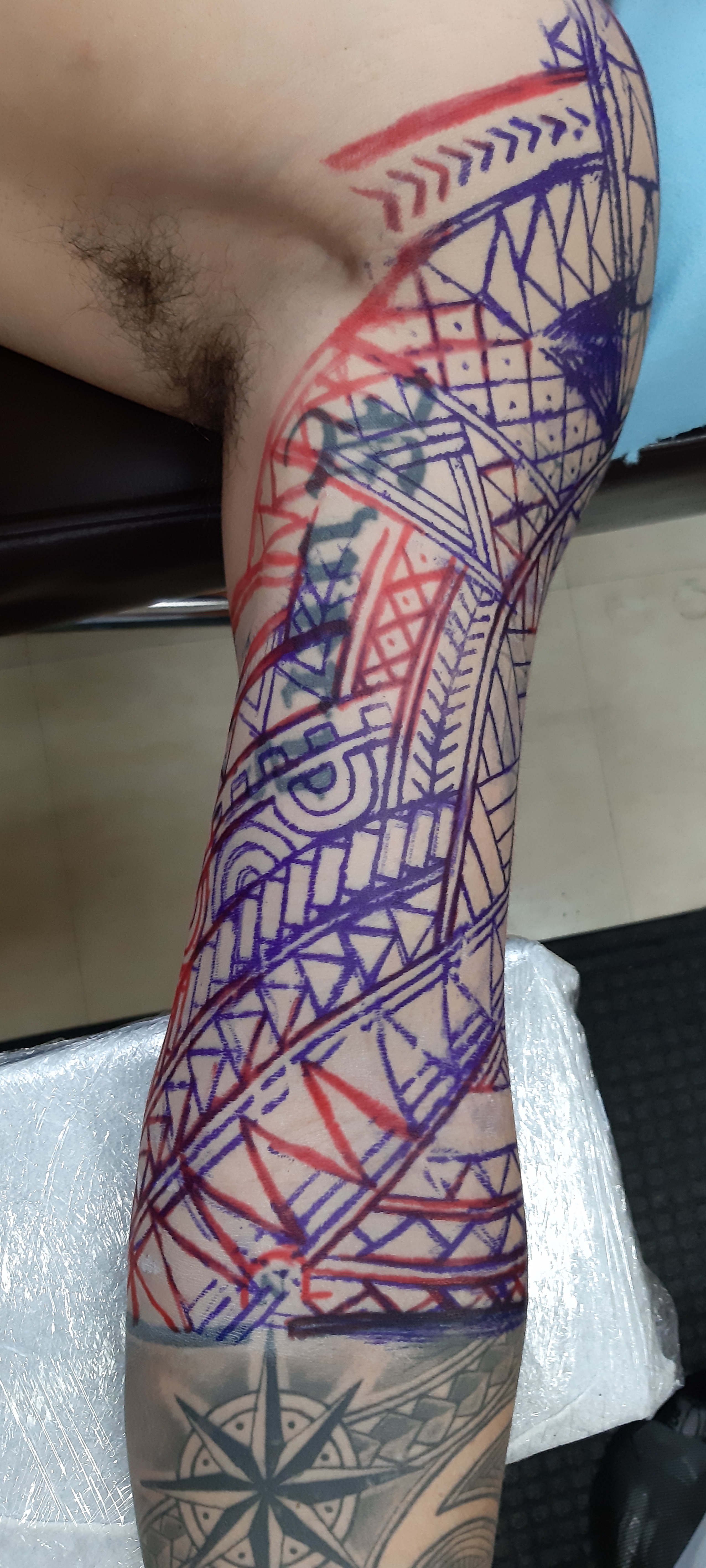 腕には20センチ位のオールドイングリッシュの書体の文字が二箇所入っていました。