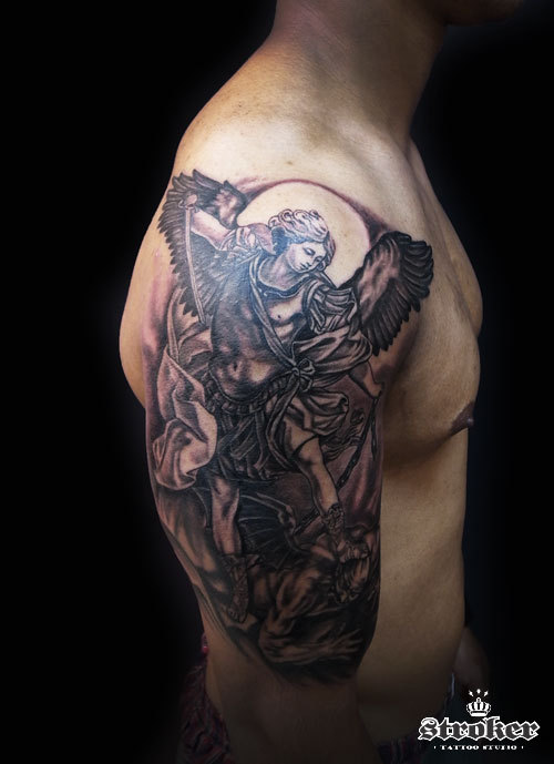 天使、ミカエルの絵画を上腕へ。