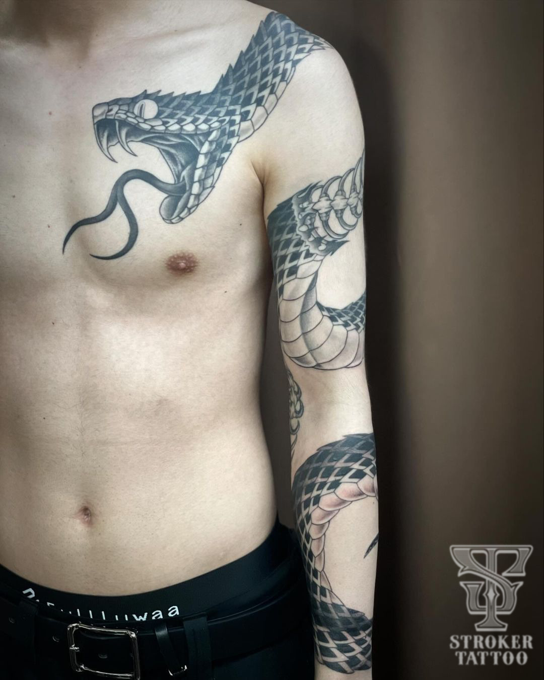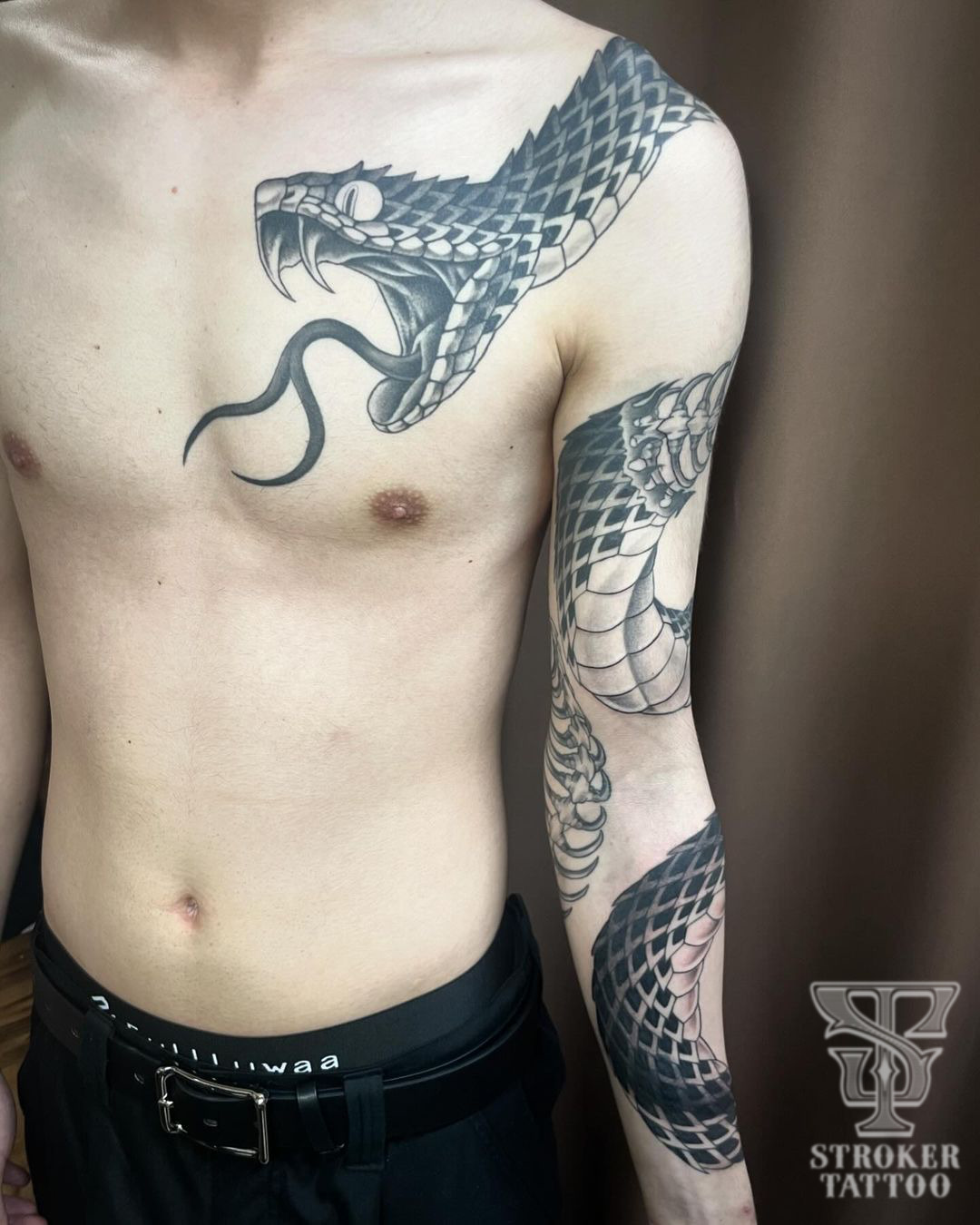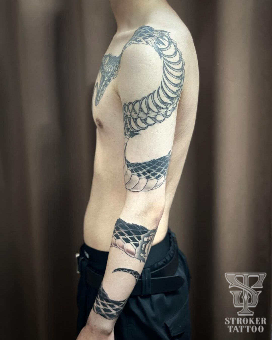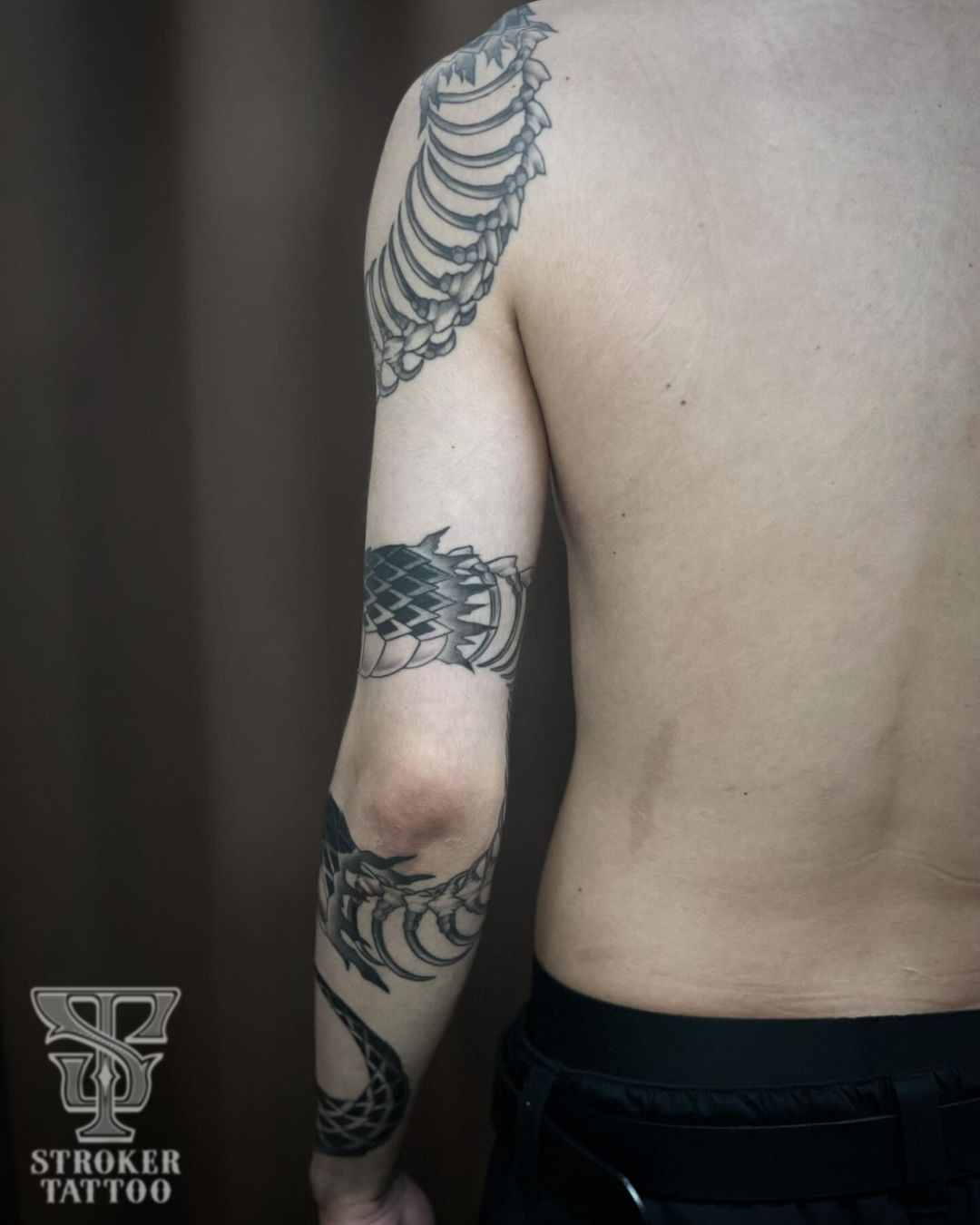肘内側に蛇の体のうねりが集結したり、肘外側に骨がぐるりと巻いたり、見る角度によって骨と鱗の比率が変わるのでひとつのタトゥーでも表情が変わった見方が楽しめます。