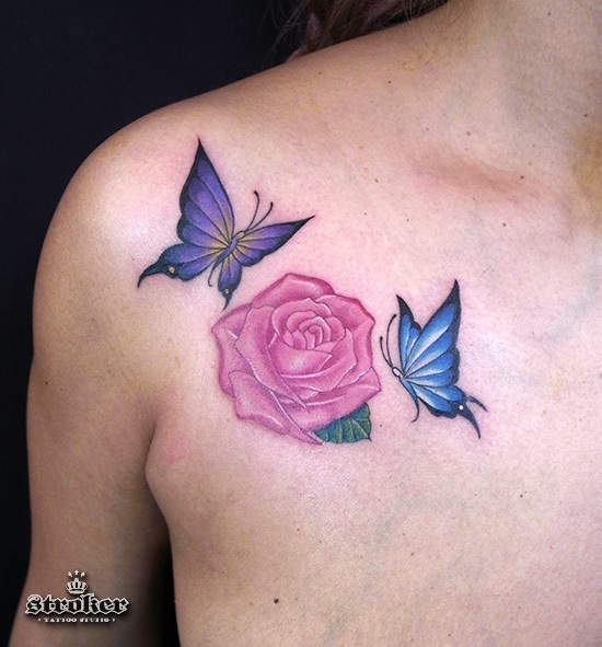 胸にピンクの薔薇と蝶。。。