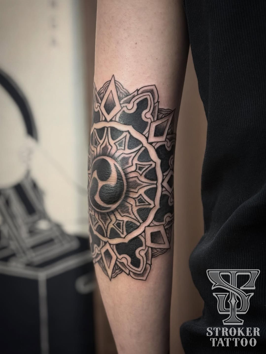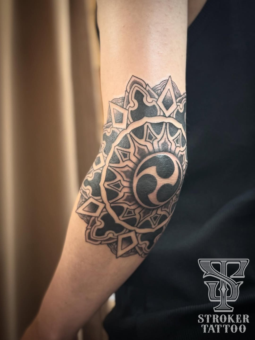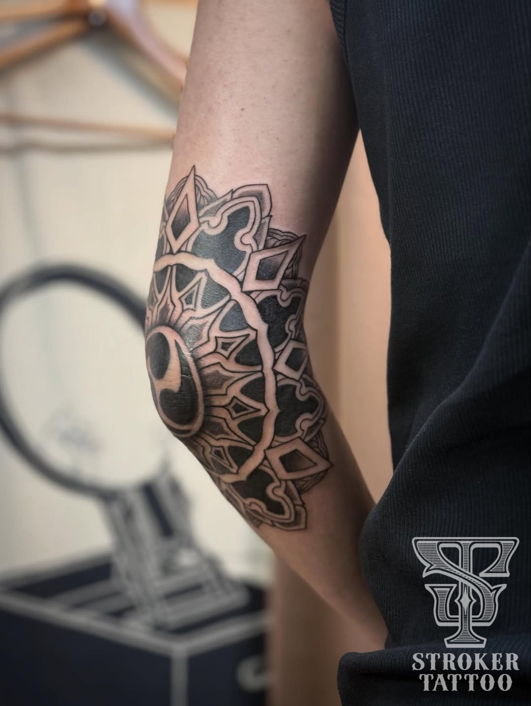 肘の丸みと動きにぴったり沿うようデザインした曼荼羅のタトゥー。