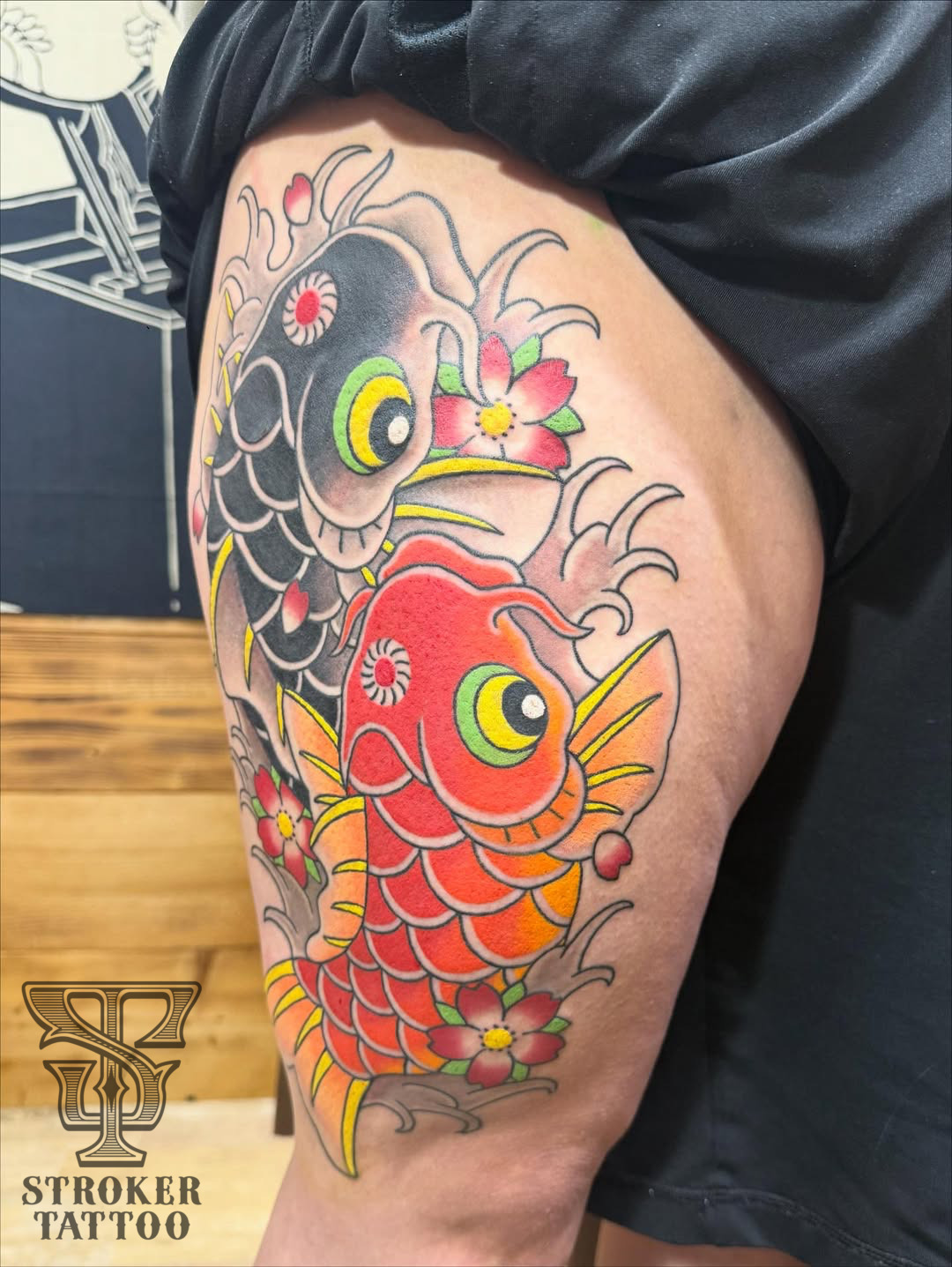 今回ご紹介するのは、大腿部いっぱいにお入れした手彫り風の夫婦鯉。