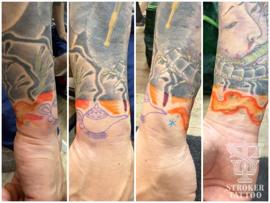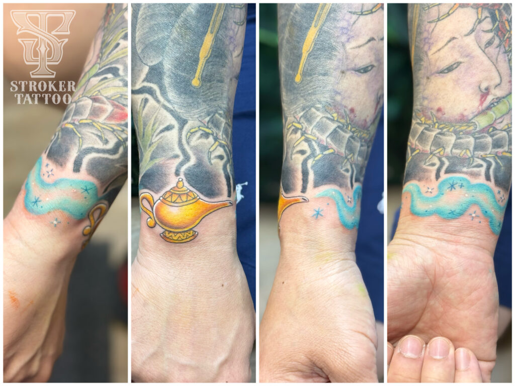 まずは、9分袖の和彫りの見切り部分の隙間に魔法のランプ🧞♂️(※和彫りは他店様作品です。)