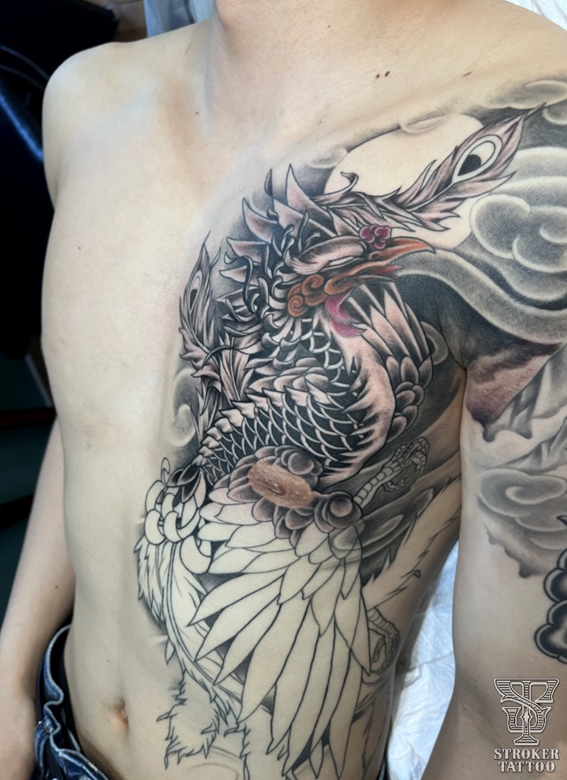 繋がる様に脇腹に朱雀を彫らせて頂いてます。ほとんどブラックアンドグレー(ぼかし)で