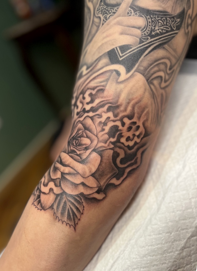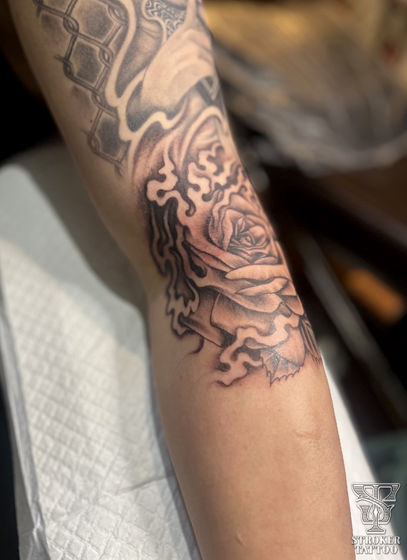 とにかく腕が太いのでこの薔薇と煙は結構大きいです、、15センチ✖︎15くらいあると思います。