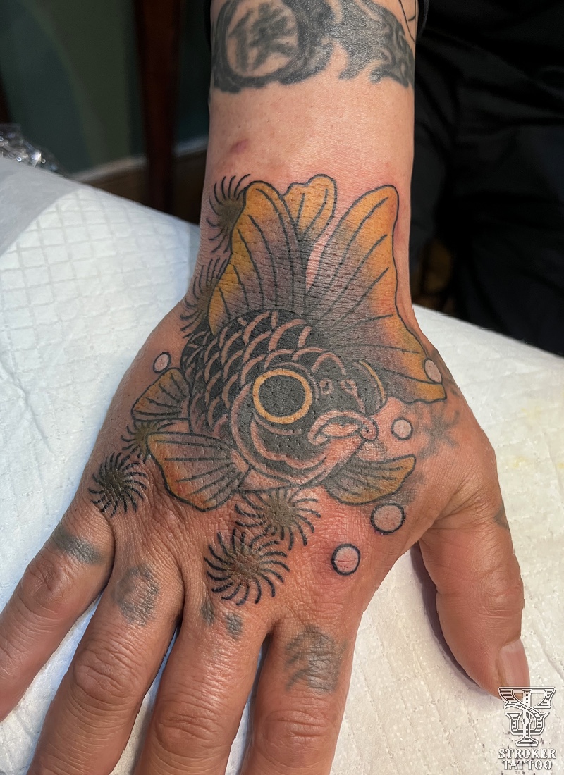 左右の手の甲に同じ出目金を色違いで彫ります。今回は片側は仕上げまで彫らせて頂きました。こちらのお客様は今後全身を担当させて頂く方でして、