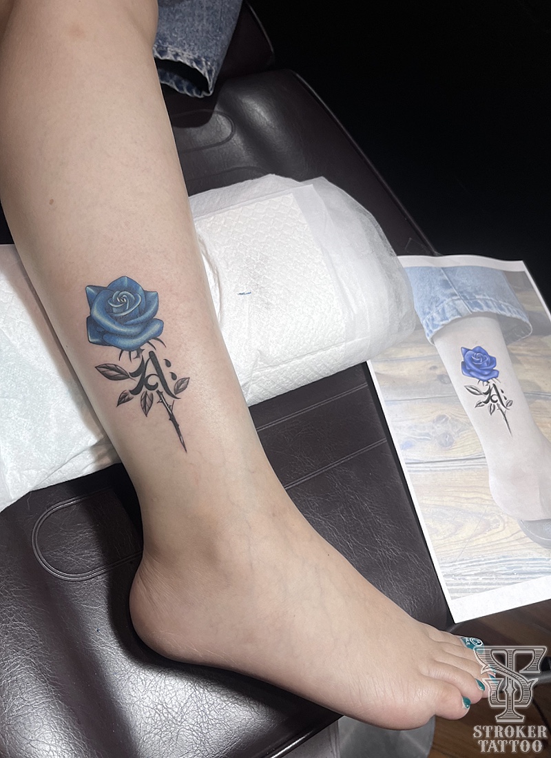 梵字と青い薔薇の組み合わせ。