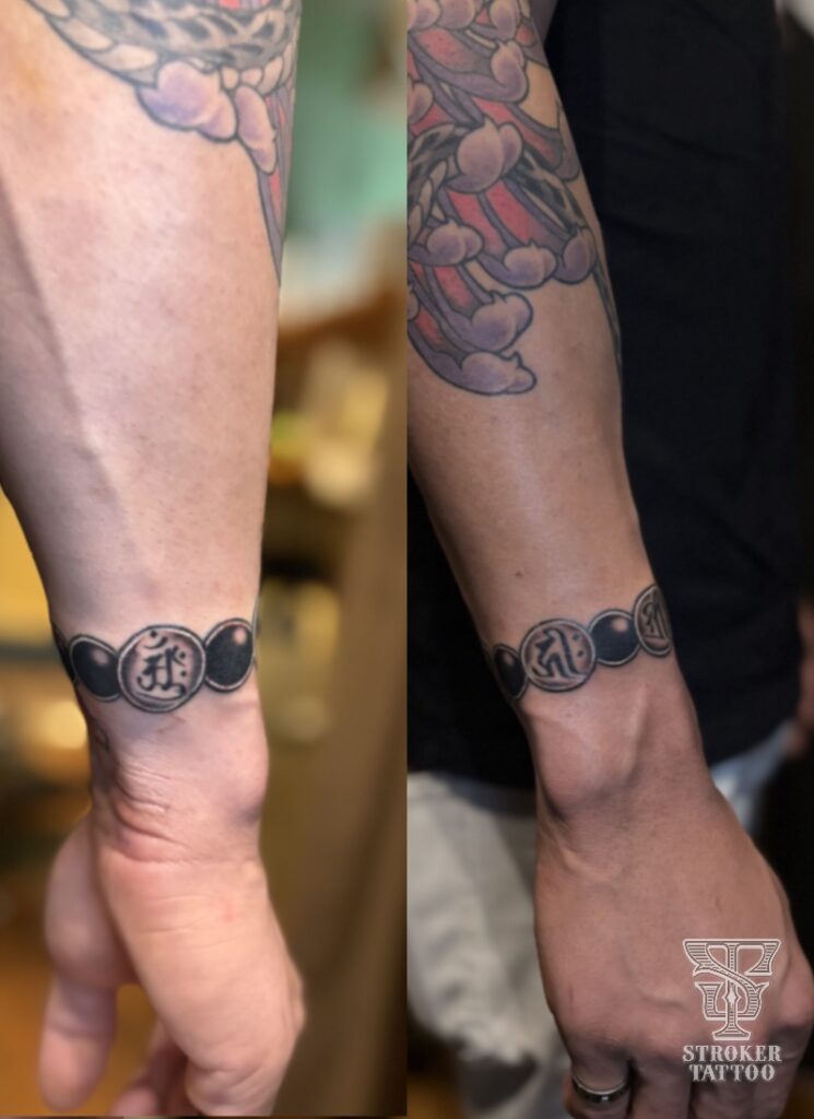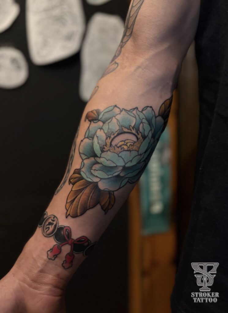 今回は、スリーブ進行中のお客様の前腕内側に施した、