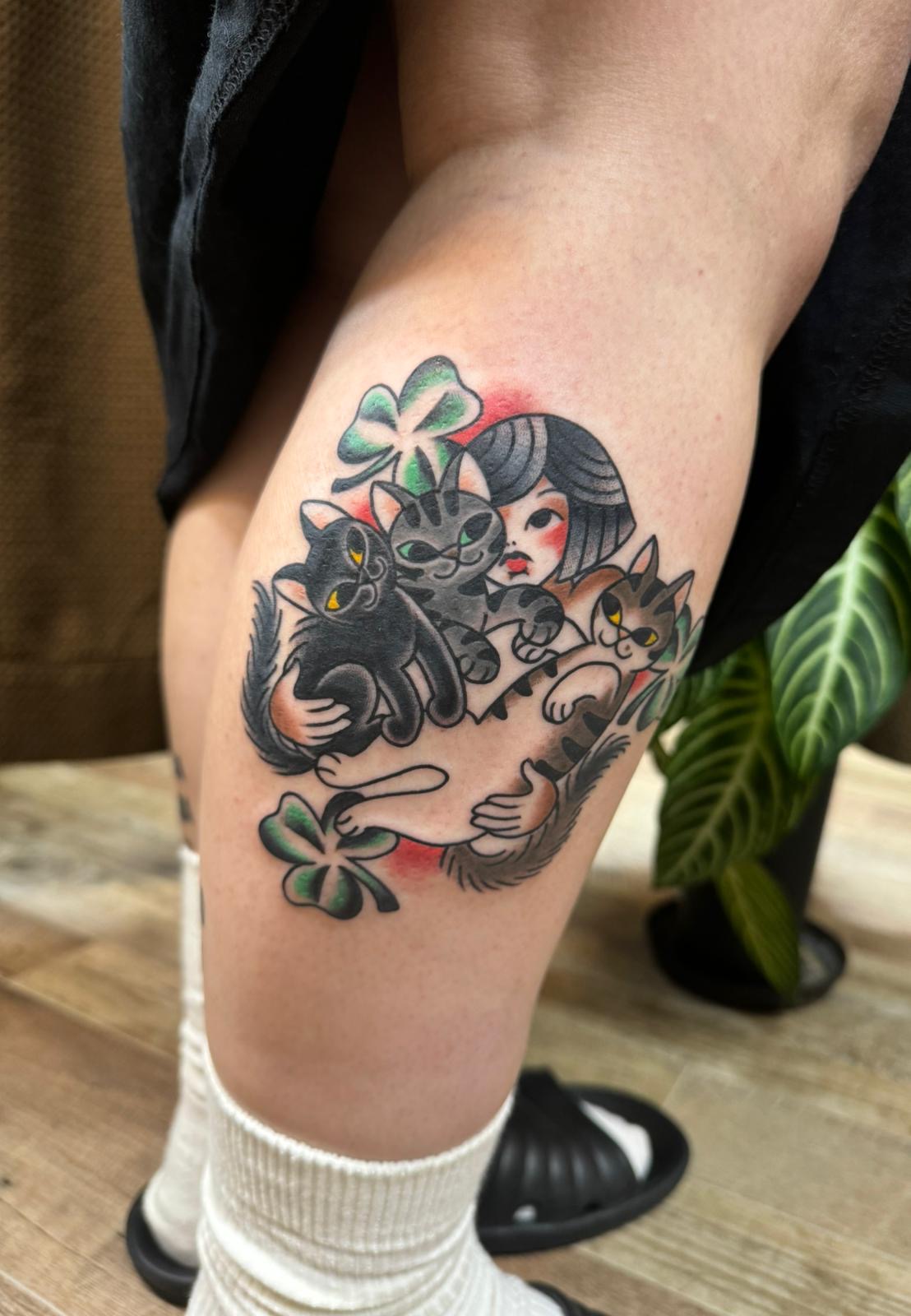 猫だらけ Posted on 2024年10月19日 in Tattoo作品【カラー】 こんばんは。 エリカです。 今日はカスタムさんが愛する3匹の猫のデザインです。 3匹それぞれの特徴を出しました。 女の子は少しカスタムさんに似せてます。 3匹ともカスタムさんを見つめていて可愛いですね。 . . 関連記事はこちら No related posts.
