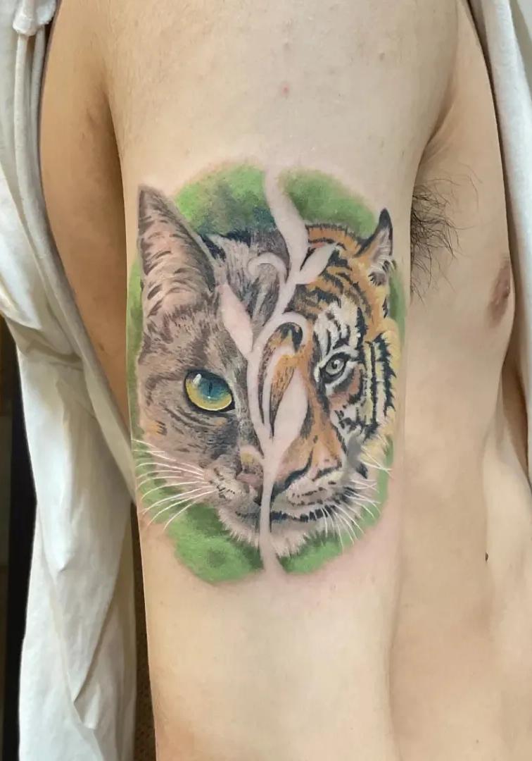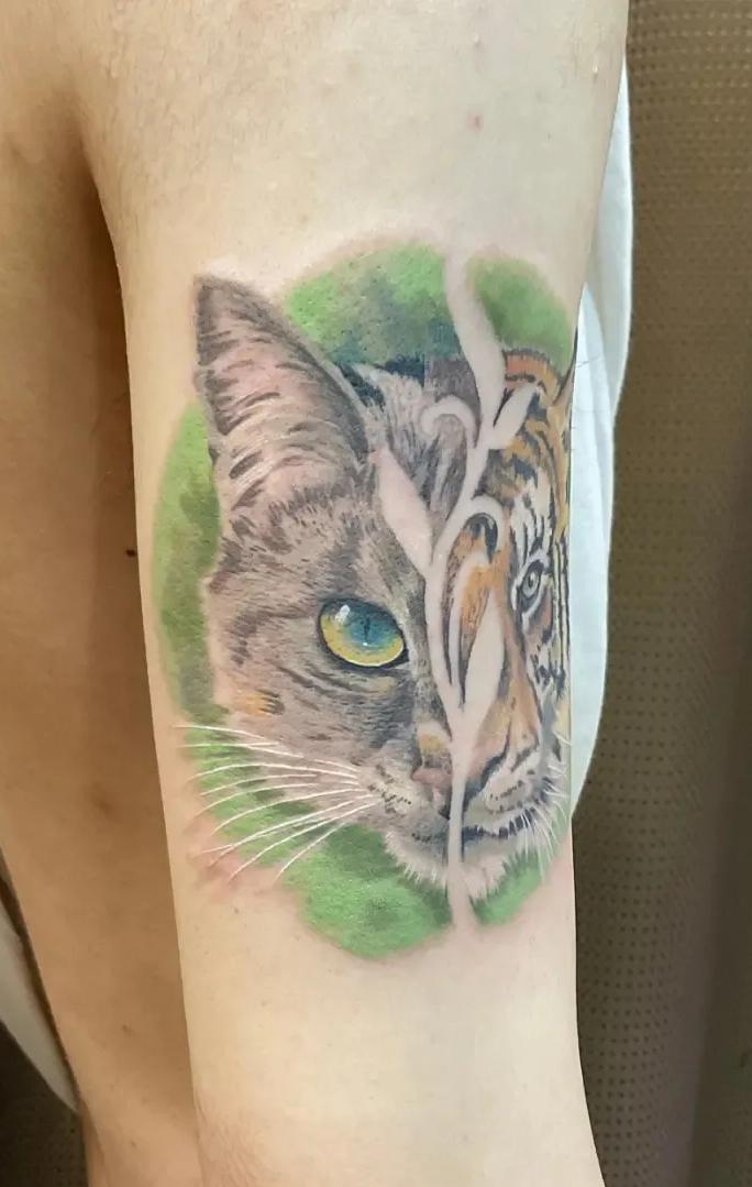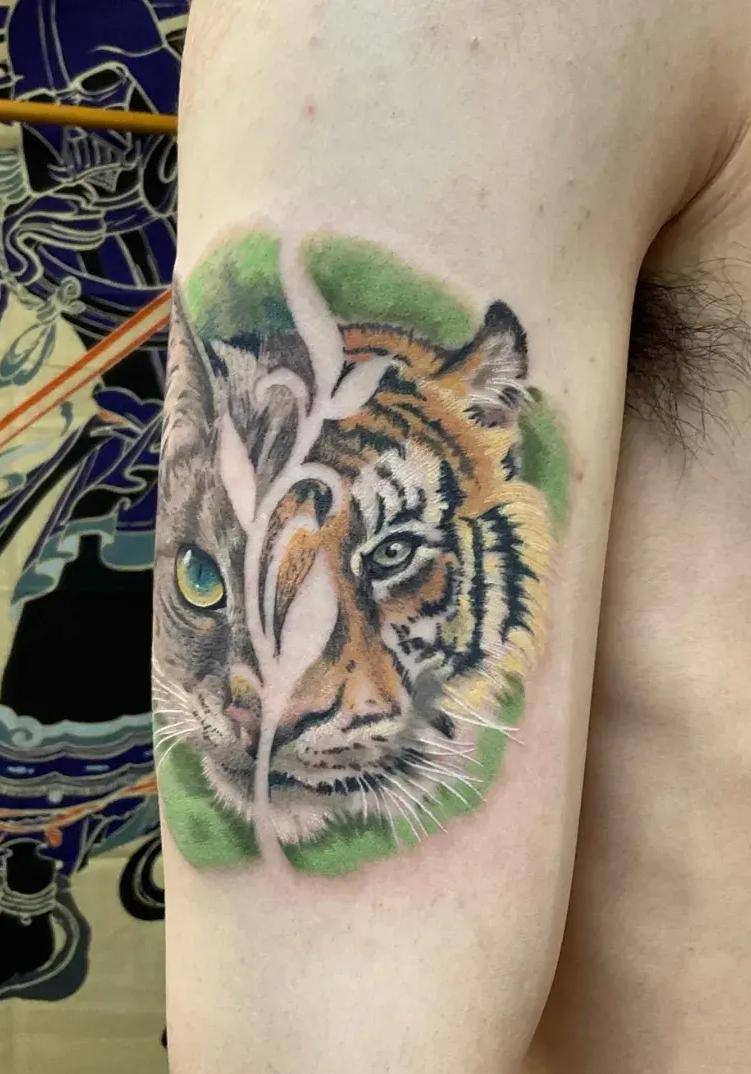 猫と虎 Posted on 2024年5月18日 in Tattoo作品【カラー】 こんばんは。 エリカです。 今日はカラーのポートレートです。 カスタムさんの好きな動物の組み合わせです。 サイズはCDケースくらいです。 . . カラーの場合は、インクを混ぜ必要なカラーに出来るだけ似ている色を作っていきます。 薄い色で彫る時は他の色で汚れてしまわないように気をつけながら彫っています。 カラーのポートレートは、ブラックアンドグレーよりお時間が必要です。 関連記事はこちら No related posts.