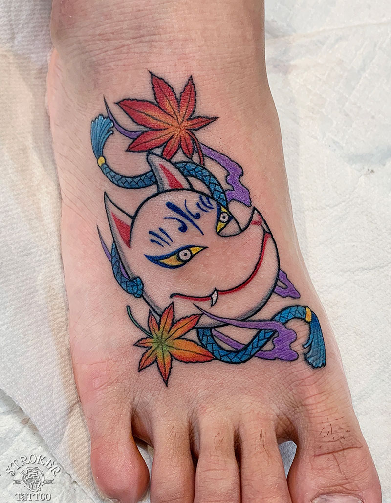 男性の足の甲に仕上げた狐面。