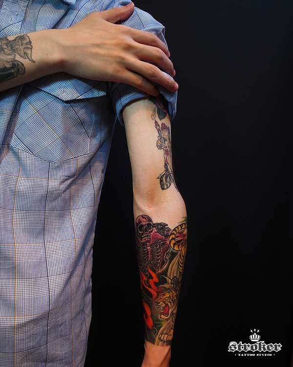 以前彫ったトラに銃口をこめかみに当てたスカルを二体。