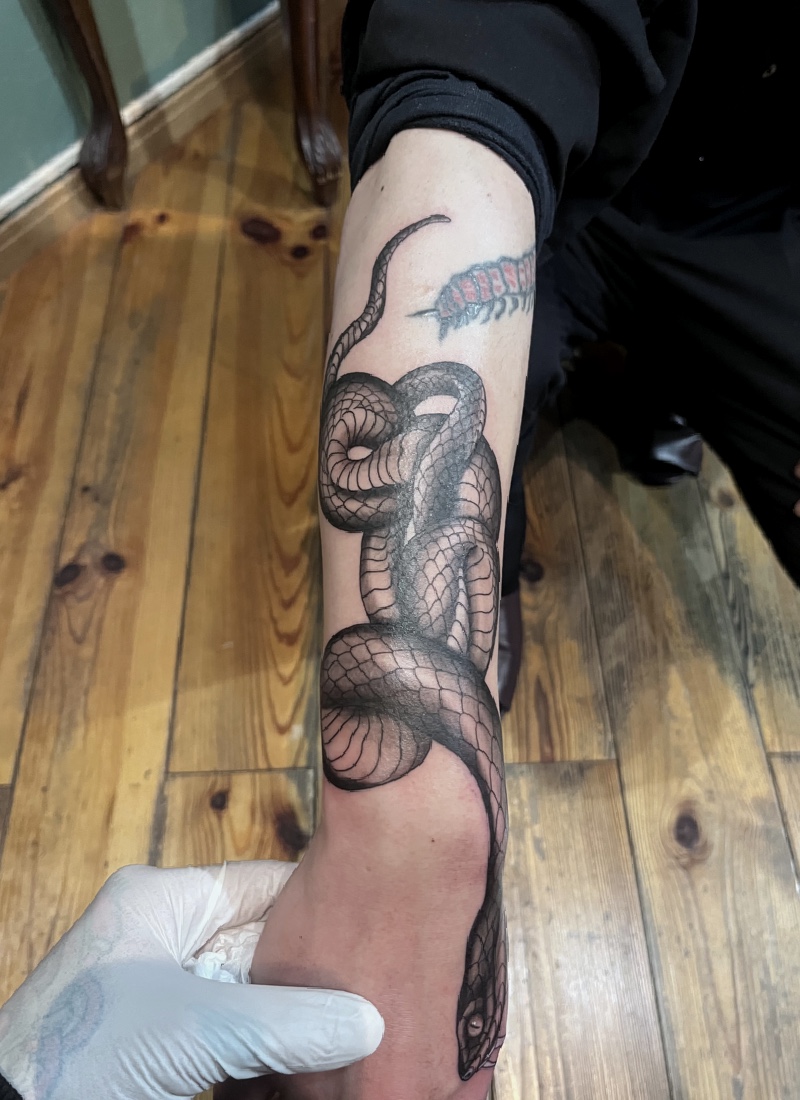 蛇を前腕から手の甲、親指辺りまで
