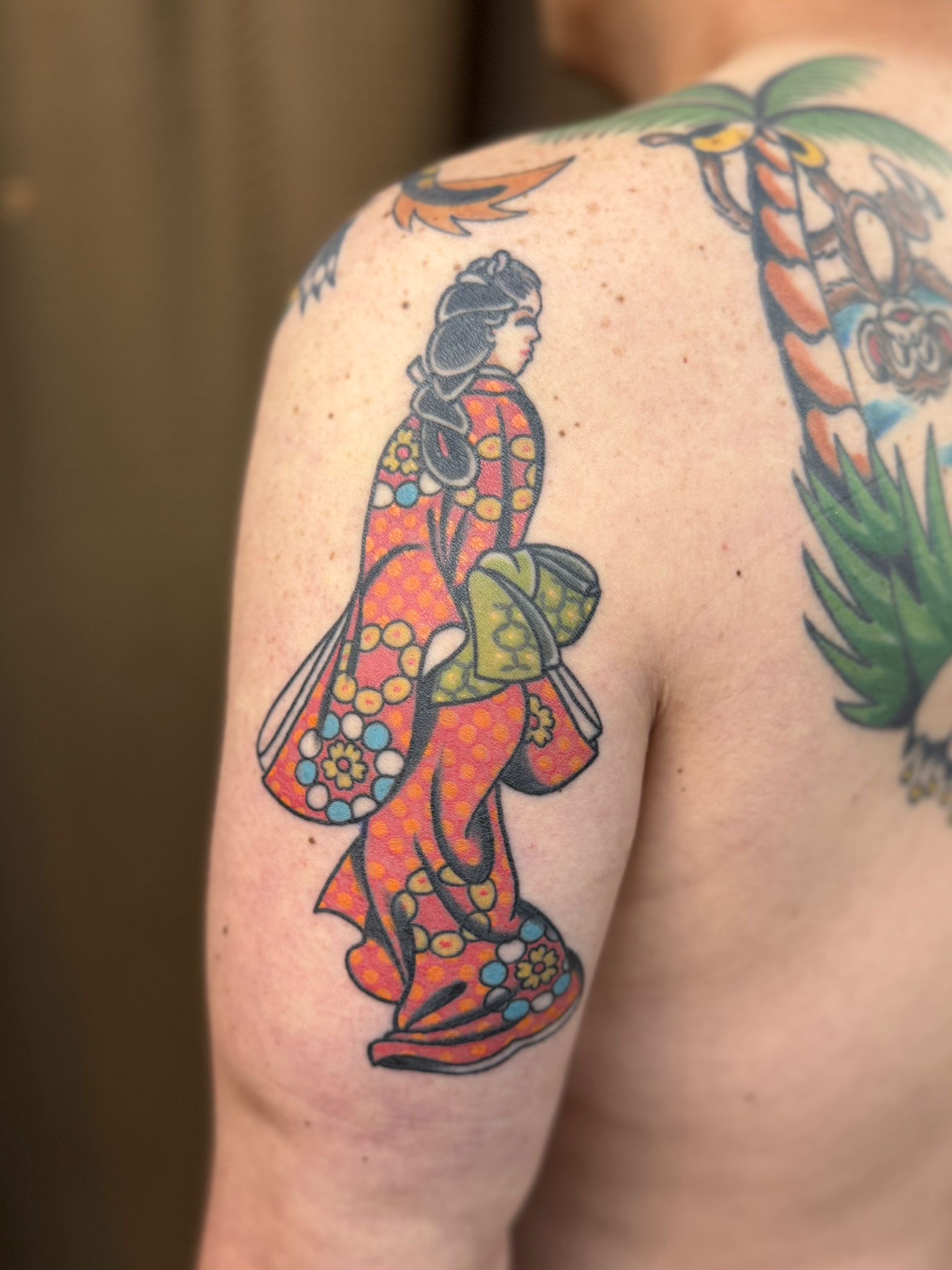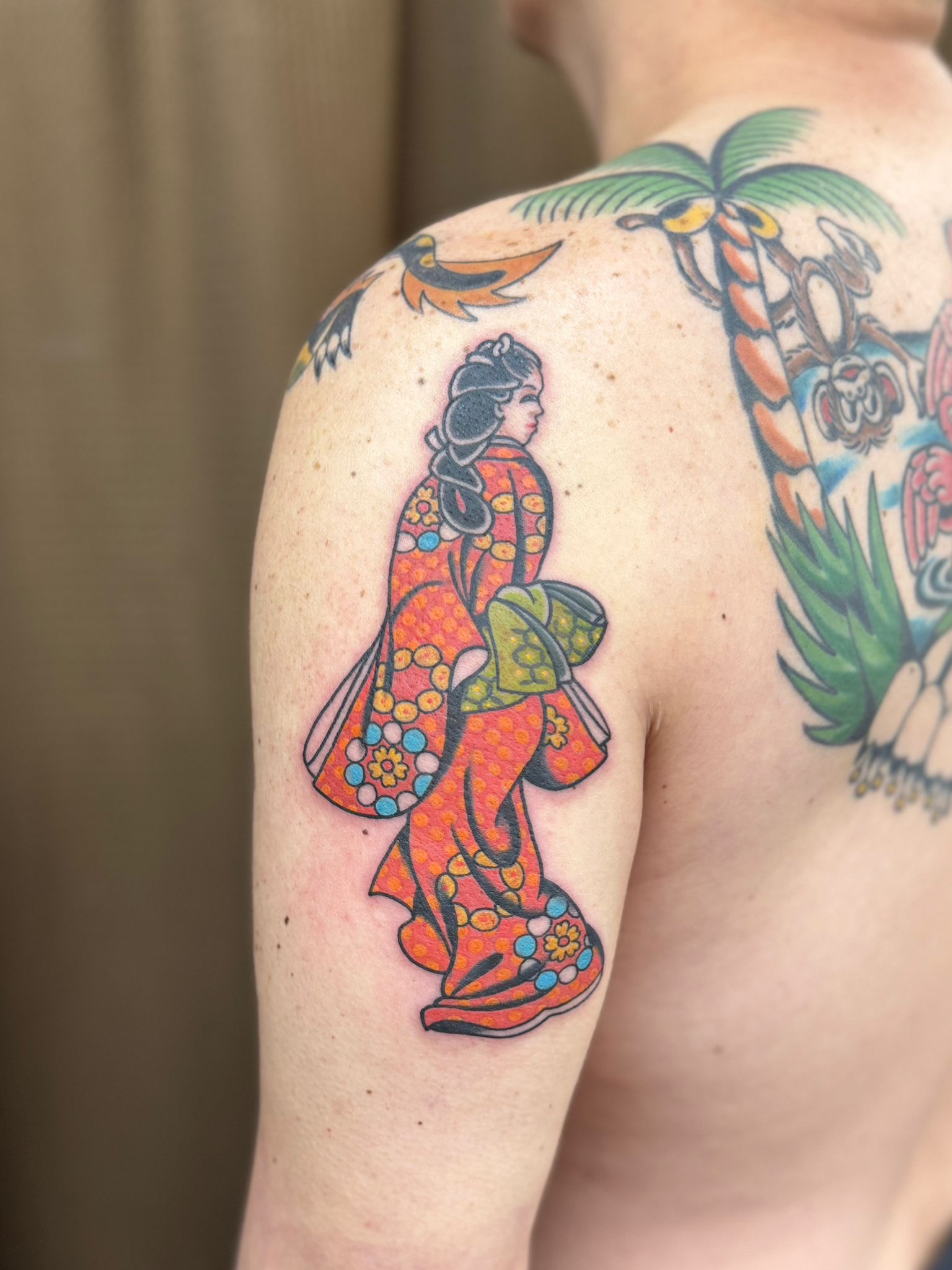 見返り美人 Posted on 2025年6月28日 in Tattoo作品【カラー】 こんばんは。 エリカです。 菱川師宣の代表作をアメトラっぽくしました。 サイズに合わせて柄はシンプルにしても本来の本質はまだ残ってますね。 艶やかな着物が目を引くデザインとなりました。 彫りたての画像 こちらのお客様はいつもほとんどお任せいただくのでデザインするのが楽しいです。 また楽しいデザインをお待ちしております。 2週間あとの画像 関連記事はこちら カラーワーク!蝶とお花のタトゥー!