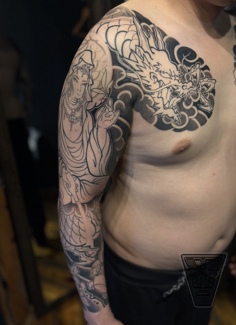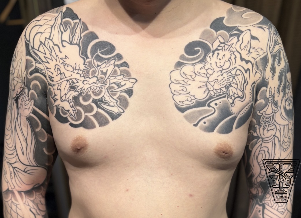 本日は、現在進行中の、両胸から両腕フルスリーブの和彫り作品をご紹介します。