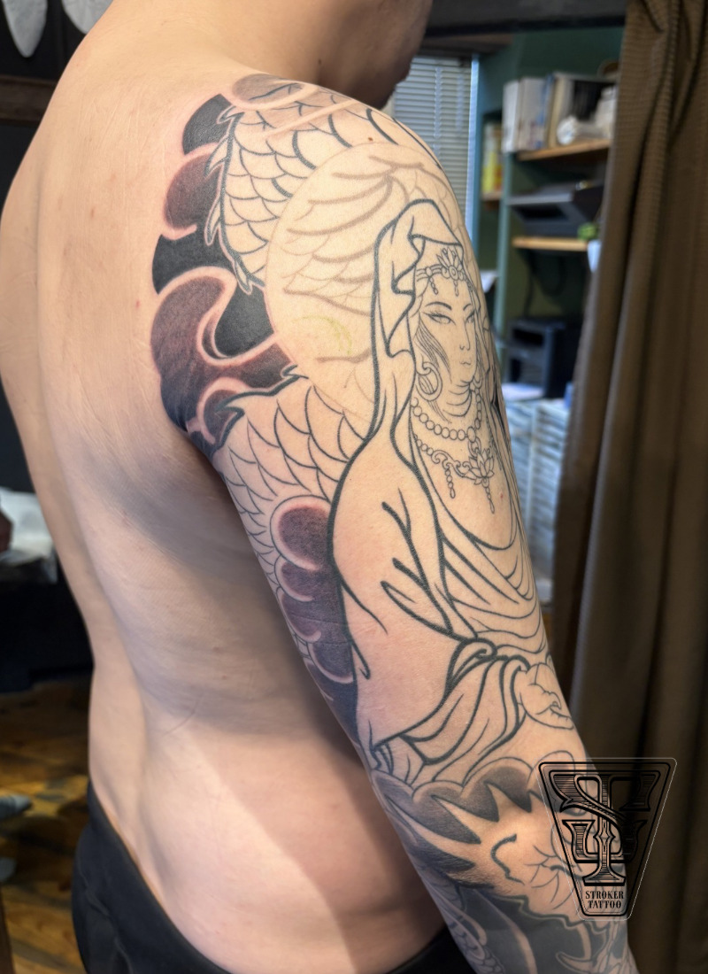 左腕の毘沙門天は、何も入っていない状態から任せていただいた、僕にとって初めての和彫りでした。