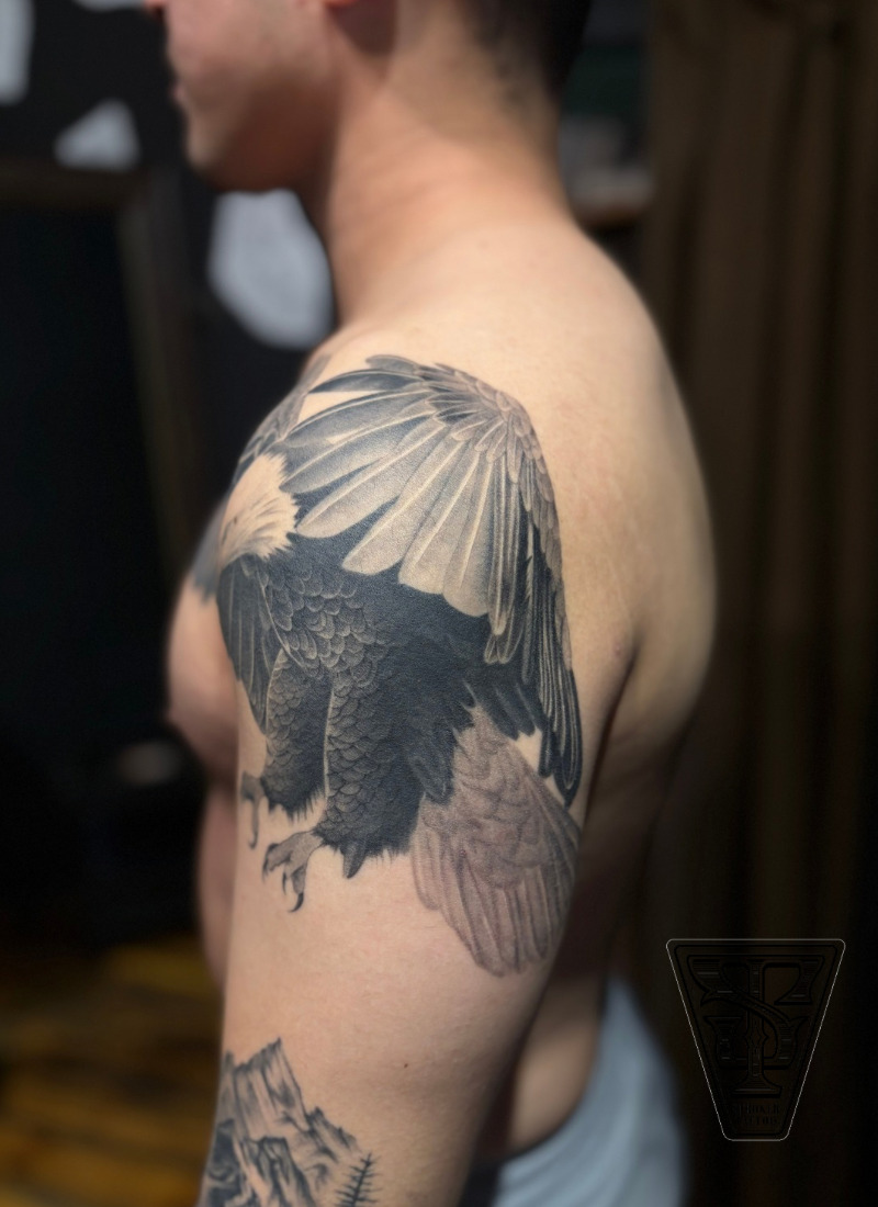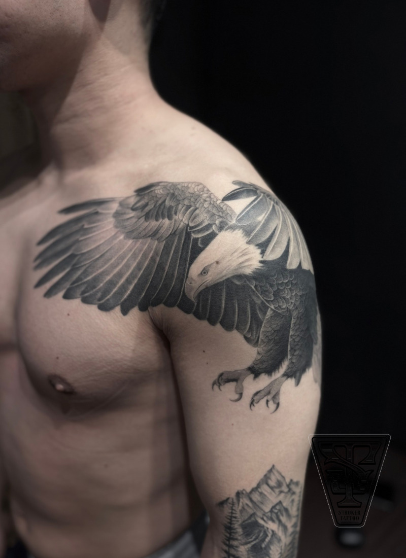 翼を広げた構図で、肩の丸みと胸のラインに沿うよう配置しています。
