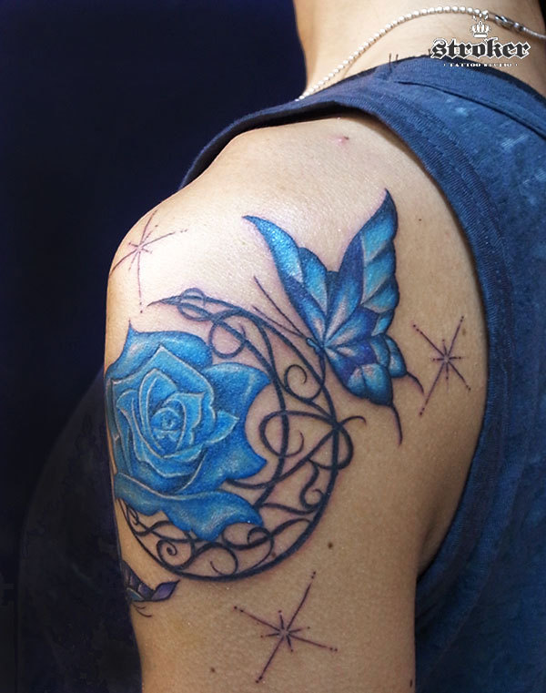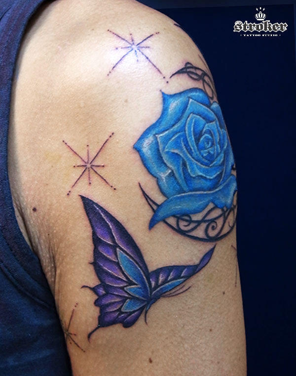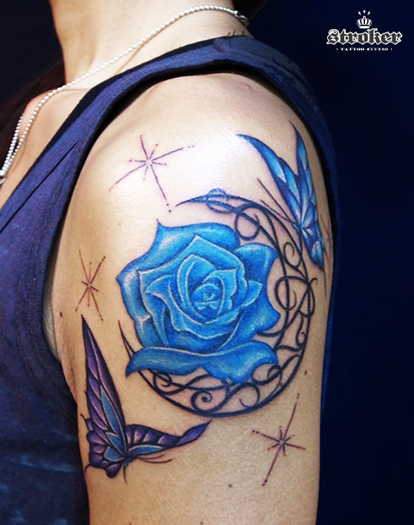 青い薔薇と蝶、そして月のtattoo。