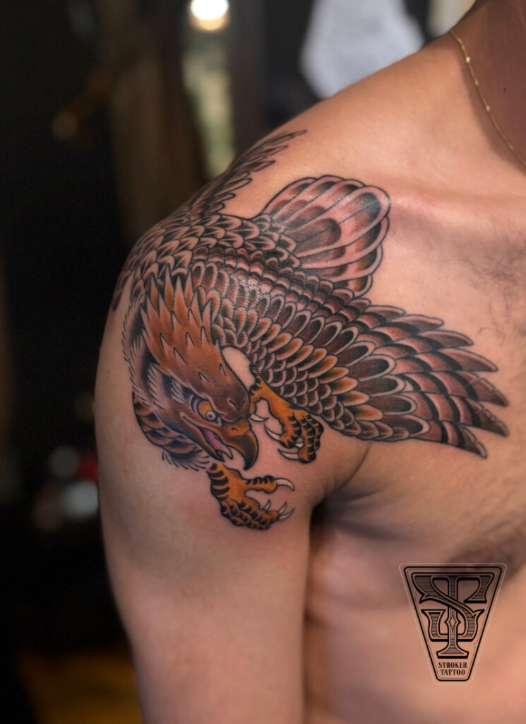一つ目の鷹は肩付近に配置し、羽を大きく広げた構図でデザインしました。