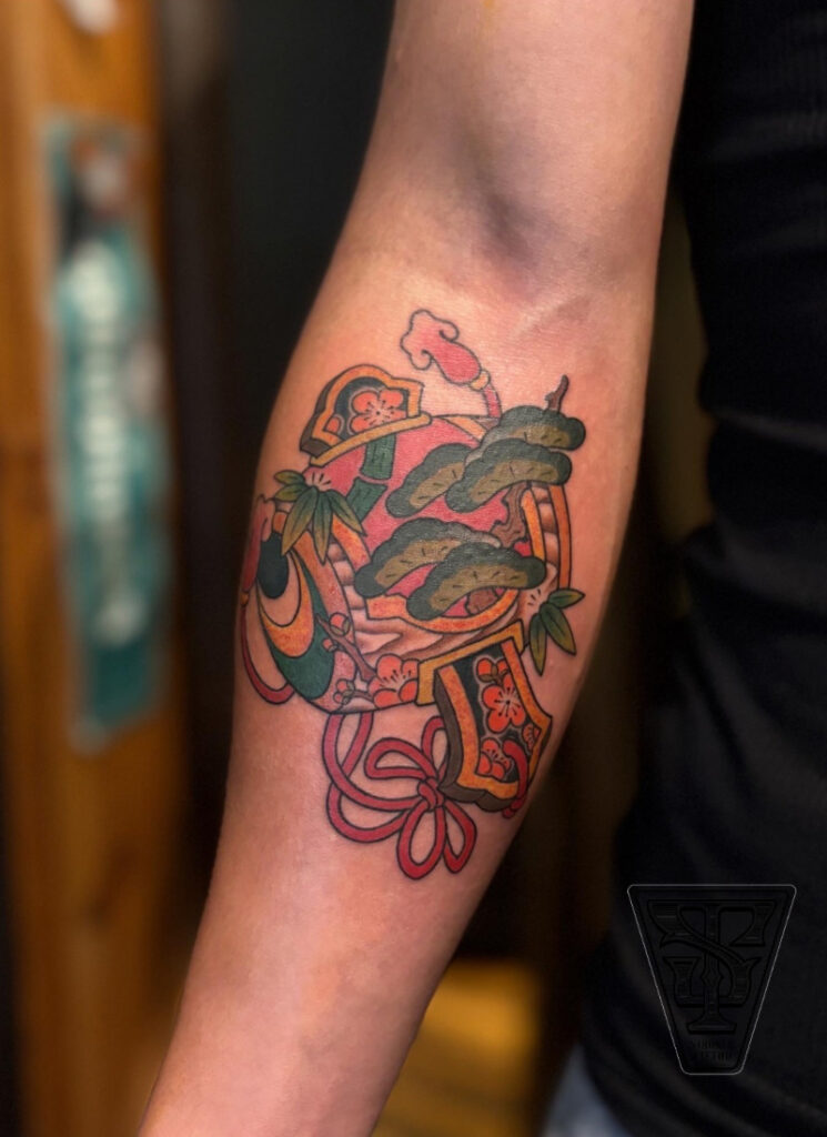 小槌のタトゥーは、松竹梅を組み合わせた縁起物のデザインです。