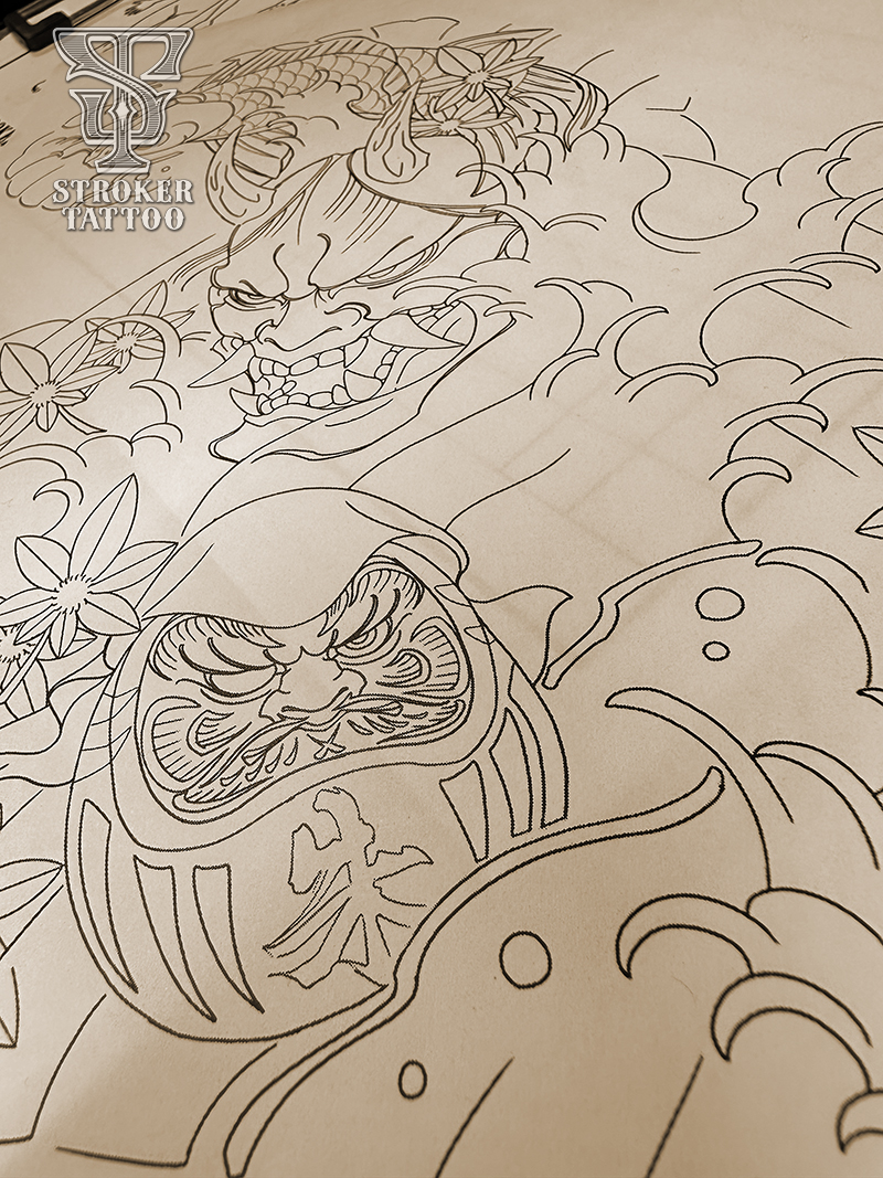 達磨と般若と鯉の和彫りです。