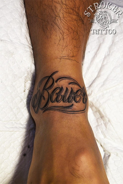 反対の足首へ文字作品がすでに入っており、