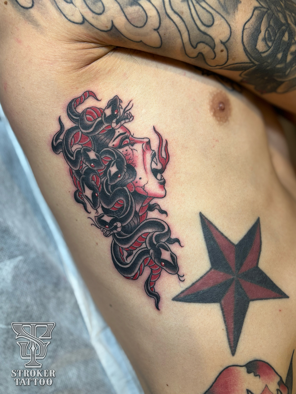 続いてこちらはメデューサのタトゥーを脇腹に。。。