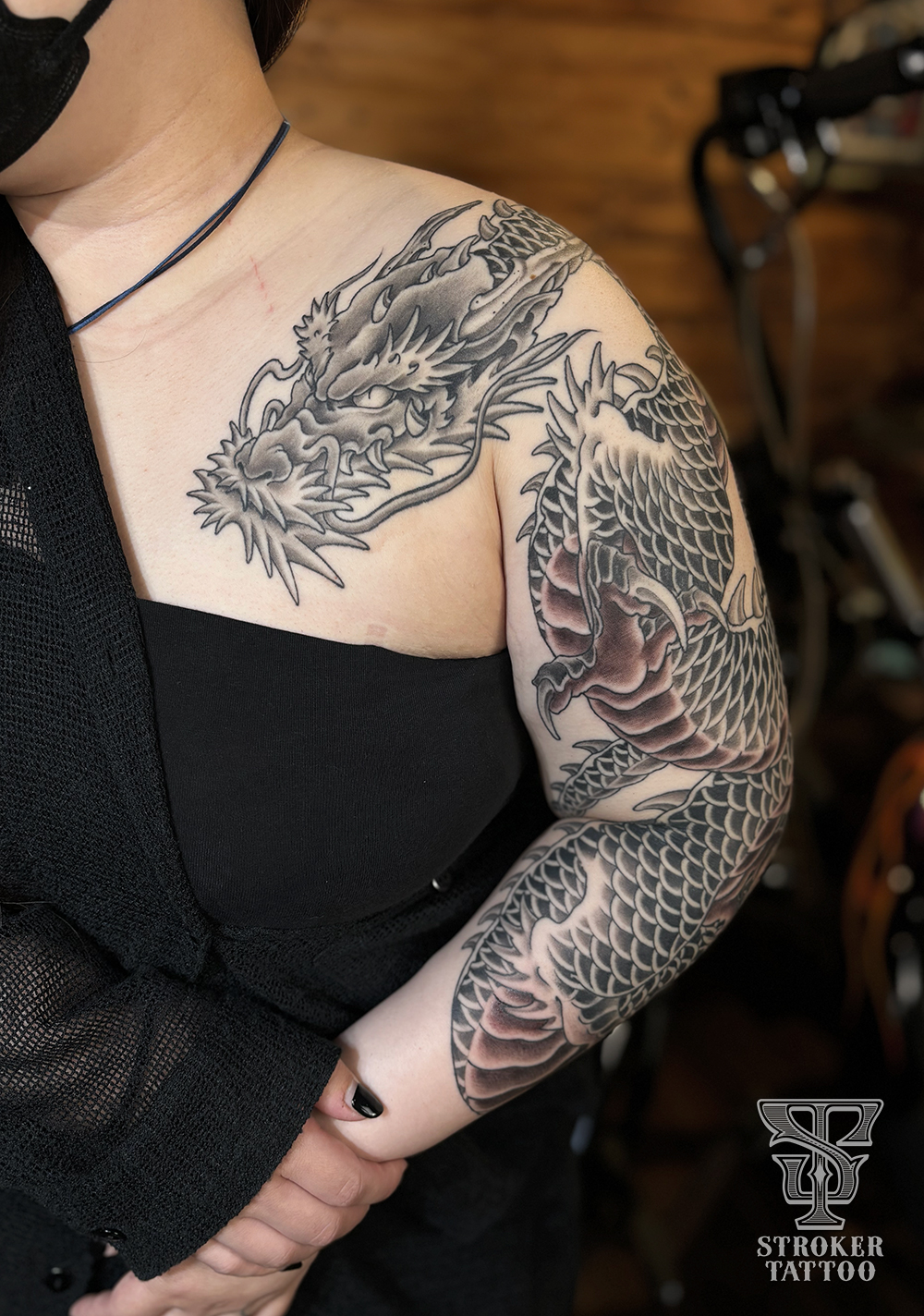 筋彫りのみ再度彫りつつ、龍となるべく馴染むようデザインさせていただきました。