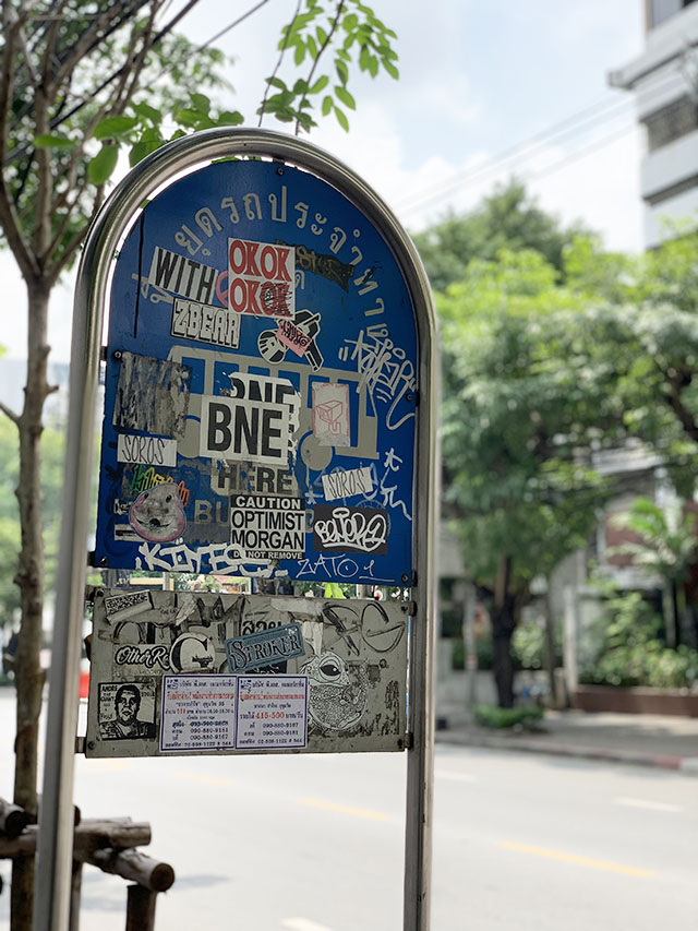 ステッカーだらけのバス停が、
